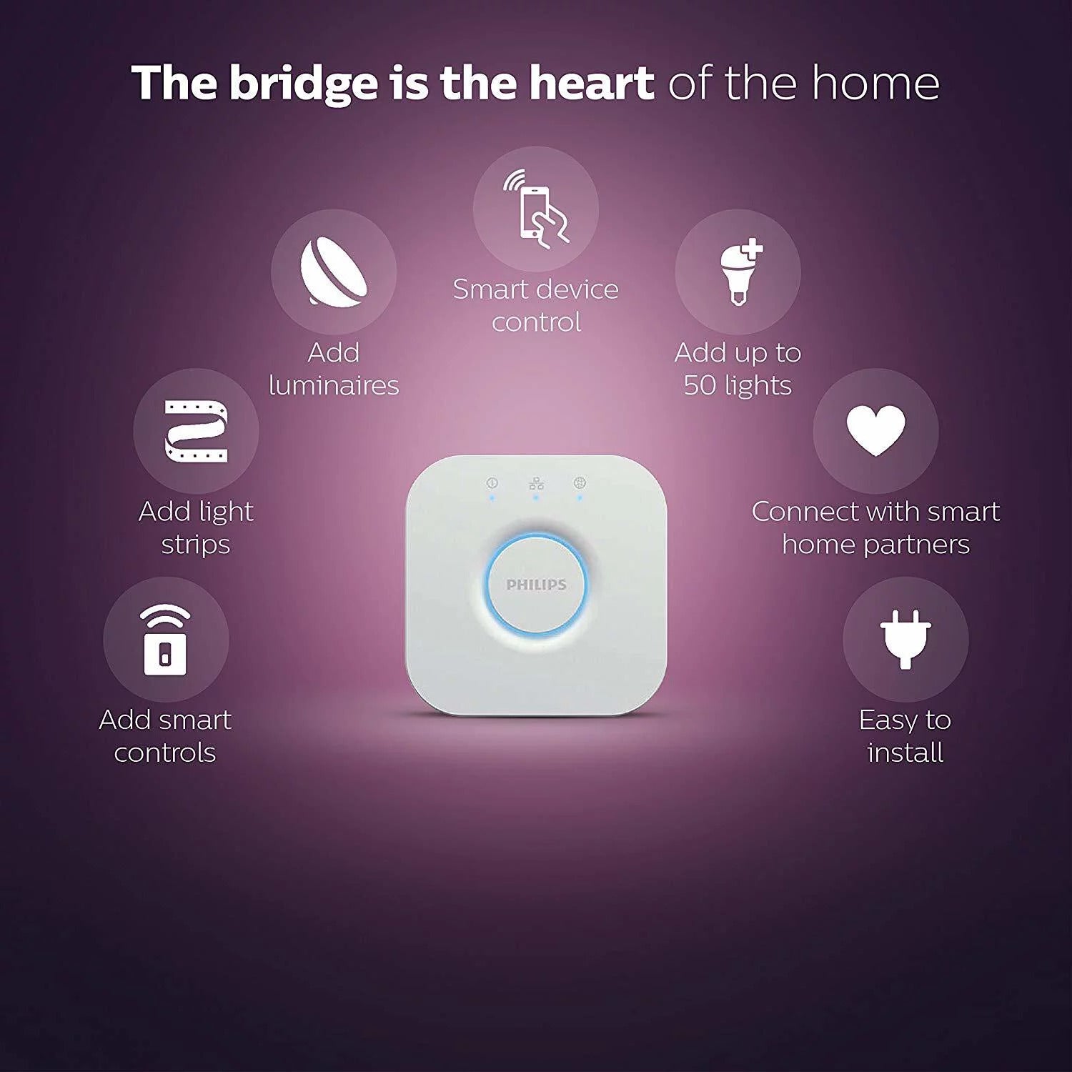 Hue 橋是飛利浦 Hue 智慧照明系統的大腦,可讓您連接和控制多達 50 個燈光和配件。只需將其插入並使用 Hue 應用程式即可設定例程、計時器、自訂燈光場景等。